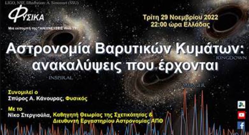Η Ομάδα Αστρονομίας Βαρυτικών Κυμάτων του ΑΠΘ έχει ενεργό συμμετοχή στα παραπάνω πειράματα. Στην εκπομπή των ΦΥΣΙΚΩΝ της 29-11-2022 ο Φυσικός Σπύρος Α. Κάνουρας φιλοξένησε και συζήτησε με τον καθηγητή Θεωρίας της Σχετικότητας και Διευθυντή του Εργαστηρίου Αστρονομίας στο Τμήμα Φυσικής του ΑΠΘ, Νίκο Στεργιούλα, για τα μέχρι στιγμής επιτεύγματα και τις νέες ανακαλύψεις που αναμένουμε τα επόμενα χρόνια.