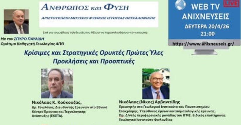 Pantelis Savvidis: Η διαδικτυακή εκπομπή «Άνθρωπος και Φύση» της WEB TV «ΑΝΙΧΝΕΥΣΕΙΣ», Δευτέρα 20 Απριλίου 2026, 9 μμ, «Κρίσιμες και Στρατηγικές Ορυκτές Πρώτες Ύλες. Προκλήσεις και Προοπτικές», στοχεύει στην ανάδειξη της σημασίας των κρίσιμων και στρατηγικών ορυκτών πρώτων υλών για τη σύγχρονη οικονομία, την ενεργειακή μετάβαση και τη βιώσιμη αξιοποίηση του ορυκτού πλούτου.