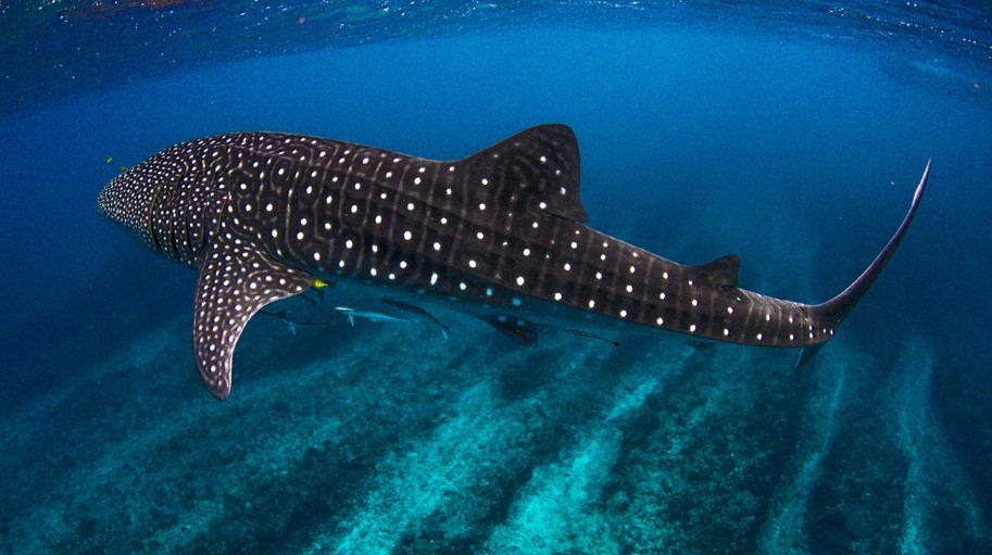 Tεράστιος φαλαινοκαρχαρίας εμφανίζεται την ώρα που γυναίκα ποζάρει κάτω από το νερό